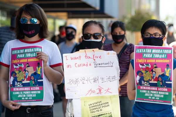 Demonstrators gathered in front of Immigration Minister Marco Mendicino's office in Toronto after the deaths of three migrant workers who contracted COVID-19 to demand full immigration status for all non-permanent residents in Canada. A Globe investigation has found lapses in federal protections for migrant workers.Galit Rodan/The Canadian Press