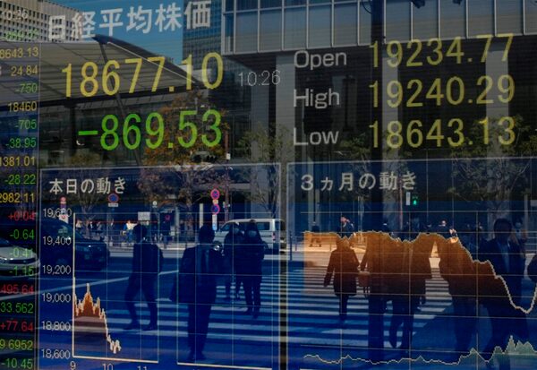 Pedestrians are reflected in a window showing a quotation board displaying the numbers on the Tokyo Stock Exchange in Tokyo on March 26, 2020. (Photo by KAZUHIRO NOGI/AFP via Getty Images)KAZUHIRO NOGI/AFP/Getty Images