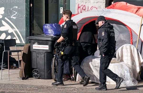 Members of the Vancouver Police Department walk past a tent on Hastings Street in Vancouver, B.C., Thursday, February 23, 2023.Rich Lam/The Canadian Press