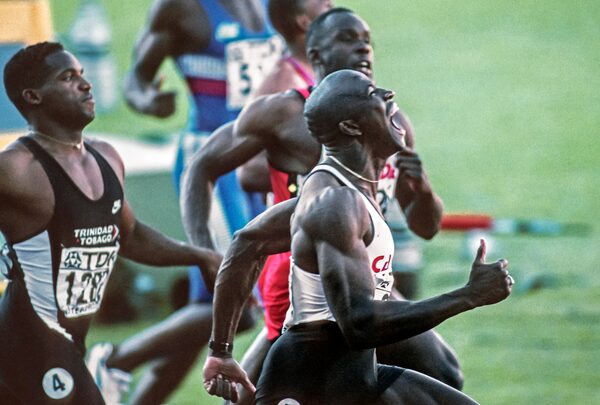 Donovan Bailey of Canada, wins the final of the men's 100-metre event at the 1995 IAAF World Championships on August 6, 1995, at the Ullevi Stadium in Gothenburg, Sweden.David Madison/Getty Images