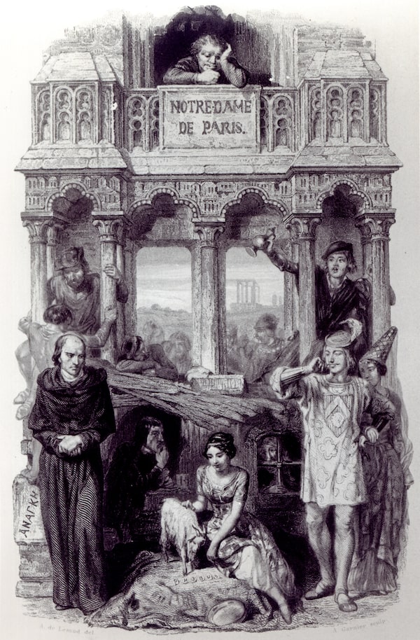 Frontispiece from the 1844 edition of 'Notre Dame de Paris' [The Hunchback of Notre Dame]. First published in 1831 by Victor Hugo, this edition's illustrations were engraved by Auguste Francois Garnier.Archives Charmet/Archives Charmet / Bridgeman Images