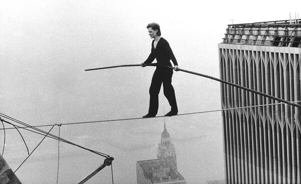Philippe Petit, a French high-wire artist, walks across a tightrope suspended between the World Trade Center's Twin Towers. New York, Aug. 7, 1974.Alan Welner/The Associated Press