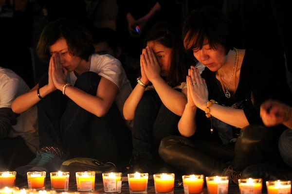 Chinese relatives of passengers on the missing Malaysia Airlines flight MH370 take part in a prayer service at the Metro Park Hotel in Beijing on April 8, 2014.AFP/Getty Images