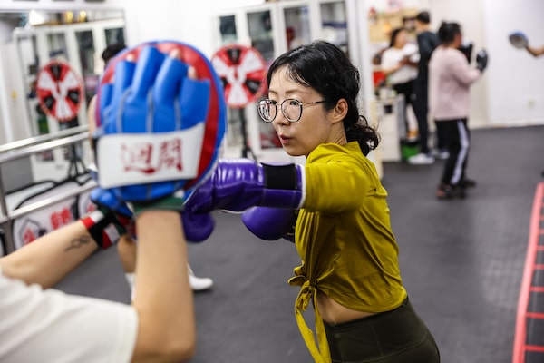 Boxing trainee Maggie Duan practices during a boxing class at Quanxinquanyi Boxing store in Beijing, on March 12, 2024.Howard Yuchen/The Globe and Mail