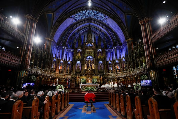 The casket of former Prime Minister Brian Mulroney is seen during his state funeral at Notre-Dame Basilica in Montreal on March 23, 2024.BLAIR GABLE/Getty Images