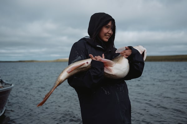 Shiloh Simpson holds a large trout near the Ekwǫ̀ Nàxoède K'è campsite.PAT KANE/The Globe and Mail