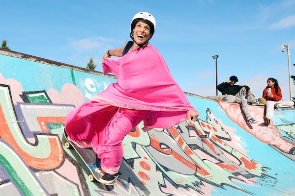 Oorbee Roy skateboards in front of her kids Rohan Shah, 12, and Avnee Shah, 15, at East York Skatepark in Toronto. April 30, 2025.Jess Deeks/The Globe and Mail