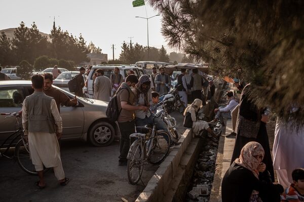 People hoping to gain access, gather outside the international airport in Kabul, Afghanistan on Aug. 25, 2021.JIM HUYLEBROEK/The New York Times News Service