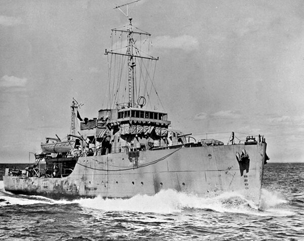 Undated photo of the Canadian minesweeper HMCS Esquimalt, which sank off the waters near Halifax, within sight of the shore, just three weeks before the end of the war in Europe, April 16, 1945.Canada. Department of National Defence