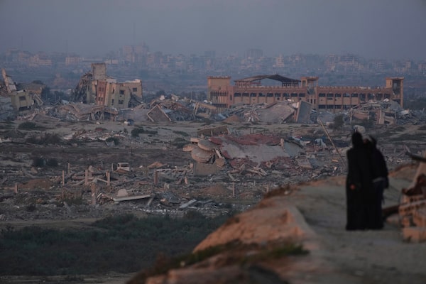 Palestinians look at the destruction caused by the Israeli air and ground offensive, in central Gaza Strip, Sept. 4.Jehad Alshrafi/The Associated Press