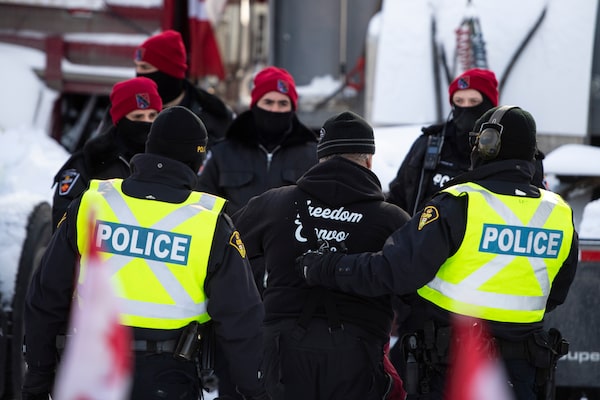 A trucker is led away after leaving his truck as police aim to end an ongoing protest against COVID-19 measures that has grown into a broader anti-government protest, on its 22nd day, in Ottawa, on Feb. 18, 2022.Justin Tang/The Canadian Press