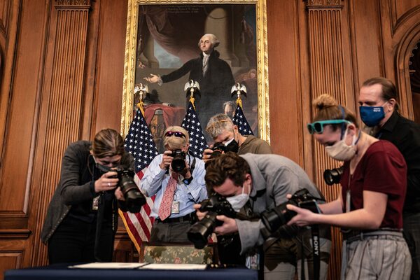 Photographing the article of Impeachment against President Donald Trump before being signed by Speaker of the House Nancy Pelosi (D-Calif.), at the Capitol in Washington on Wednesday, Jan. 13, 2021.Anna Moneymaker/The New York Times News Service