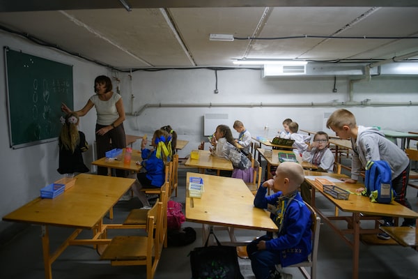 Schoolchildren, seen in Pavlohrad on Sept. 17, are forced to study in a bomb shelter because of the possibility of Russian shelling.Olga Ivashchenko/The Globe and Mail