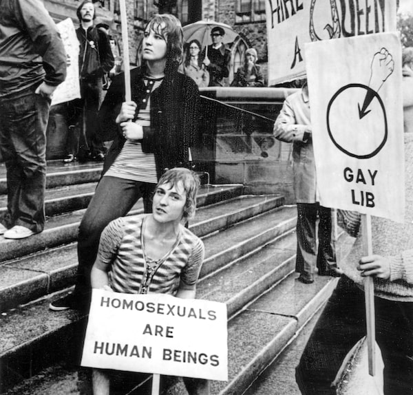Rain failed to dampen the enthusiasm of close to 100 gay activists who demonstrated on Parliament Hill in Ottawa Saturday, August 28, 1971, demanding equal rights for gay people.The Canadian Press