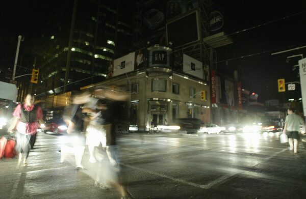 People cross the street at the corner of Yonge Street and Dundas in Toronto, August 14, 2003. A blackout brought much of Ontario to a standstill, turning off power to as many as 10 million people as a massive outage hit eastern North America.David Lucas/Reuters