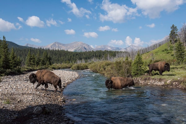 Wild Plains bison cross the Panther River in Banff National Park in this recent handout photo. Parks Canada says wild plains bison that were reintroduced to Banff National Park are now officially free-roaming animals. Officials say 31 bison were released into a 1,200 square-kilometre zone along the park's eastern slopes that features meadows and grassy valleys for grazing.Dan Rafla/Parks Canada via The Canadian Press