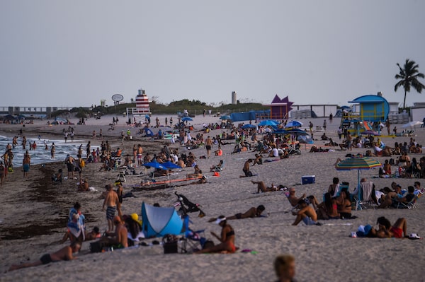 People relax on the beach in Miami Beach, Florida, on July 28, 2020, amid the coronavirus pandemic. Florida reported a record number of COVID-19 deaths on Tuesday.CHANDAN KHANNA/AFP/Getty Images