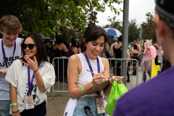 Savanna Collins fills out the pledge to vote card given to her by Amelia Zehnder, a volunteer in Florida.Tina Russell/The Globe and Mail