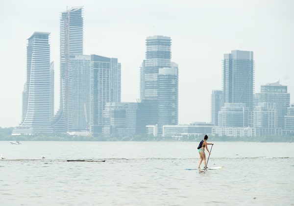 A women paddle boards along Lake Ontario in the extreme heat in Toronto on July 19, 2019.Nathan Denette/The Canadian Press