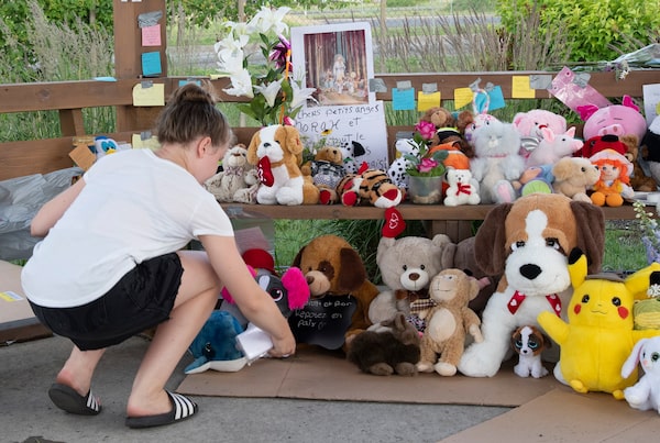 A teenager leaves a message at a memorial for Norah and Romy Carpentier, on July 12, 2020 in Levis, Que.Jacques Boissinot/The Canadian Press