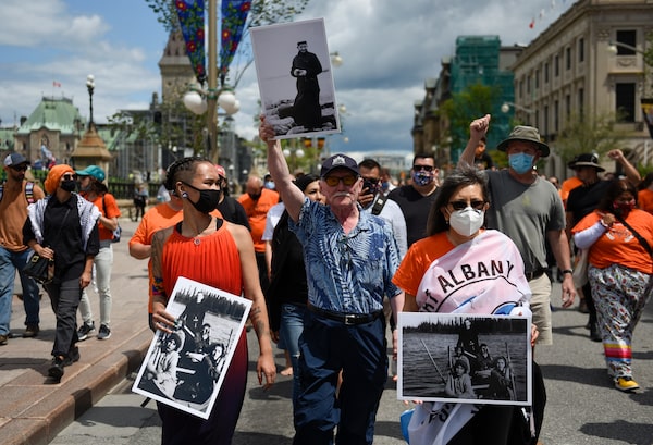 Elder Piita Irniq, centre, holds up an image of Fr. Johannes Rivoire, who is wanted in Canada for abusing children in Nunavut but now resides in France, as he marches with NDP MP Mumilaaq Qaqqaq and Elder Evelyn Korknaz during a rally in Ottawa on July 31, 2021, to demand an independent investigation into Canada's crimes against Indigenous Peoples, including those at Indian Residential Schools.Justin Tang/The Canadian Press