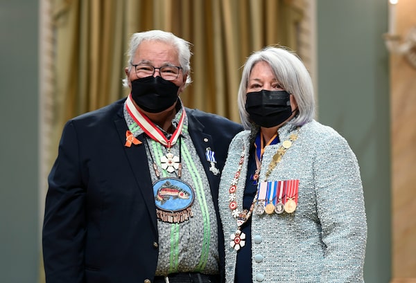 Justice Murray Sinclair stands with Gov.-Gen. Mary Simon after being invested as a companion of the Order of Canada, at Rideau Hall, in Ottawa, on May 26.Justin Tang/The Canadian Press