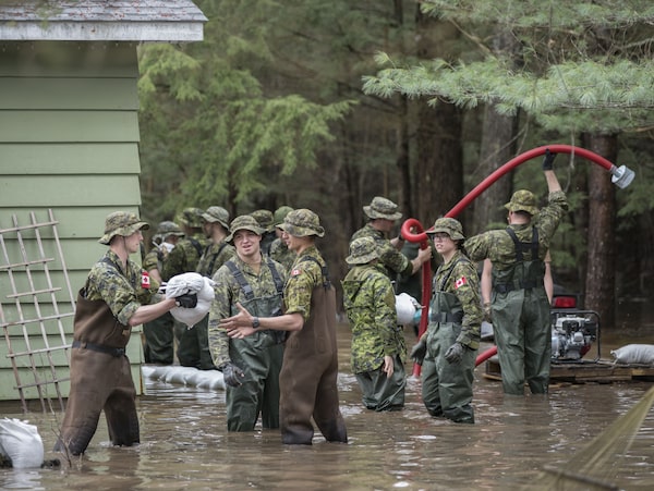 Members of the 2nd Platoon from Aurora deploy sandbags around and pump water from flooded homes in Bracebridge, Ont. on Friday, May 3.J.P. MOCZULSKI/J.P. Moczulski