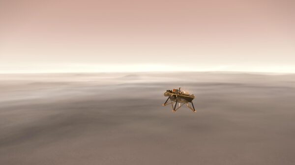 This illustration shows a simulated view of NASA's InSight lander firing retrorockets to slow down as it descends toward the surface of Mars.NASA/JPL-Caltech