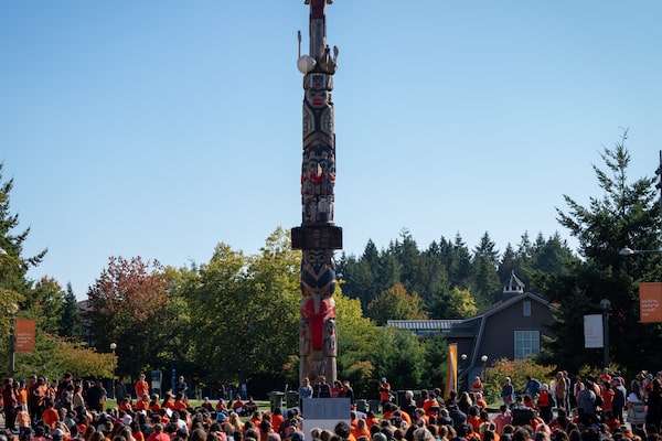 People gather at the Reconciliation Pole at the University of British Columbia to listen to residential school survivors stories during National Day for Truth and Reconciliation in Vancouver, on Sept. 30, 2023.ETHAN CAIRNS/The Canadian Press