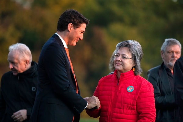 Prime Minister Justin Trudeau shakes hands with Phyllis Webstad, residential school survivor and the founder of the Orange Shirt Day movement, during a sunrise ceremony to mark the National Day of Truth and Reconciliation on Sept. 30, 2022.Nick Iwanyshyn/The Canadian Press