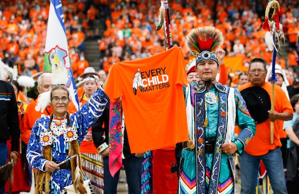 Sherry Starr and Wab Kinew lead the grand entrance at the second annual Orange Shirt Day Survivors Walk and Pow Wow in Winnipeg, Sept. 30, 2022.JOHN WOODS/The Canadian Press