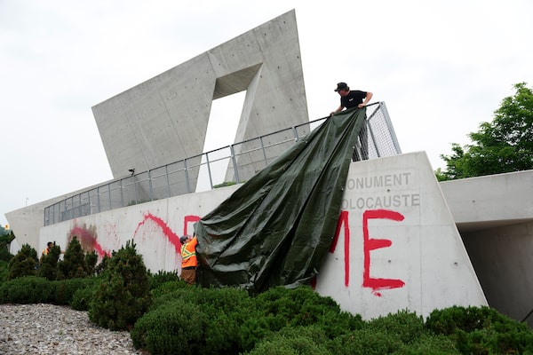 Workers from a cleanup crew spread a tarp to cover red paint spelling out the words 'FEED ME' on the National Holocaust Monument in Ottawa on June 9.Sean Kilpatrick/The Canadian Press