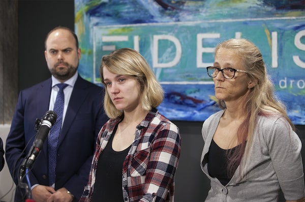 Jayde Scott, accompanied by lawyer Mathieu Picard, left, and her mother, Bev Cuppens, addresses a news conference in Moncton on April 11, 2019.Ron Ward/The Canadian Press