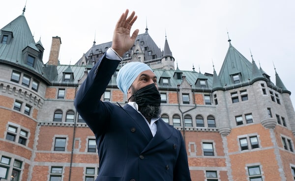 New Democratic Party Leader Jagmeet Singh waves to a pedestrian during a campaign stop in Quebec City, Friday, Sept. 3, 2021.Adrian Wyld/The Canadian Press