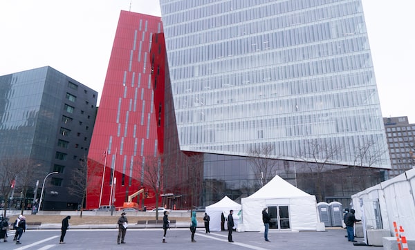 People standing metres apart lineup outside a walk-in COVID-19 test clinic, in Montreal, on March 23, 2020.Paul Chiasson/The Canadian Press