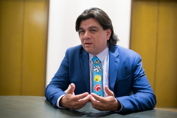 TORONTO, JUNE 21, 2018 - LANG APP - Wiikwemkoong Chief Duke Peltier speaks to the Globe and Mail on June 21, 2018 in Toronto, about an app which he hopes will help preserve a language.Peltier (Along with with Synergiq Solutions,) is hoping the Anishinaabewowin language will continue to be spoken with the help of the App called Challenge4Change designed for the retention and growth of Indigenous Languages and Culture. Glenn Lowson photo/he Globe and MailGlenn Lowson/The Globe and Mail