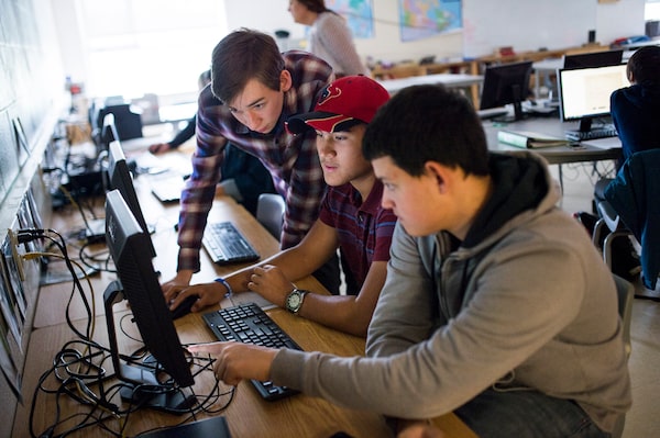 Student Hayden Merkley, left, and Seth Philion, centre, help Grade 10 student Jeremy Wright with his research by reading the wary diary of a First World War soldier during their history class at Smiths Falls District Collegiate Institute on Oct. 25, 2018.James Park/The Globe and Mail