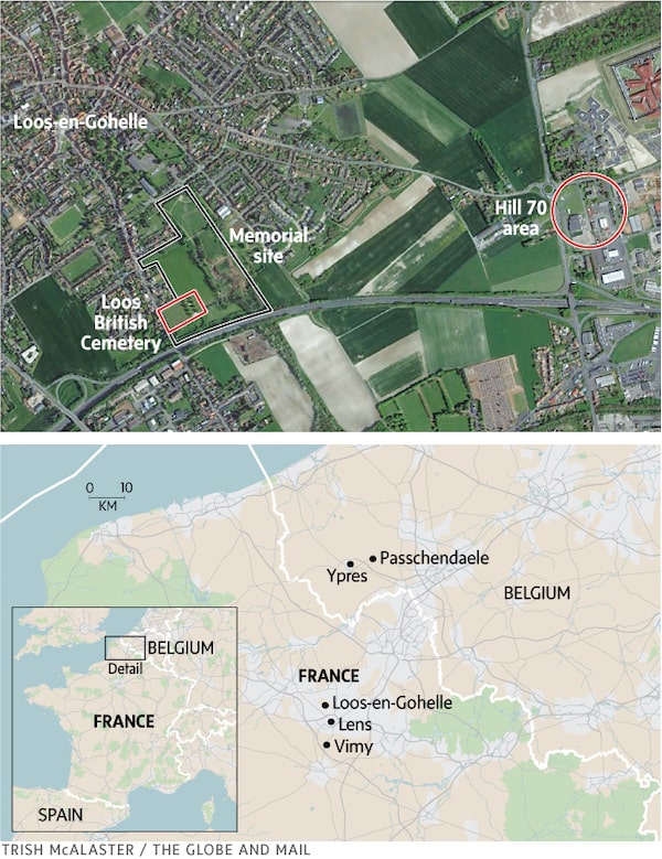 Mr. Hadfield, a retired colonel, is the spokesperson for the Hill 70 Memorial Project, another initiative that aims to raise awareness of the battle. It began with a group of Kingston-area volunteers working under retired colonel Mark Hutchings. Their campaign, completely funded privately, has raised $8-million, with another $4-million worth of goods and services provided by individuals and organizations, which they’ve used to build a memorial in an eight-hectare park at Loos, near Lens. The memorial, featuring the General Sir Arthur Currie Amphitheatre and an obelisk that stands exactly 70 metres above sea level, has a rising walkway embedded with 1,877 maple leaves to honour those who fell during the battle. Along with specific displays, there will shortly be a self-guided audio tour available for visitors, the story of Hill 70 narrated in French by broadcaster Bernard Derome and in English by actor Dan Aykroyd, both of whom volunteered their services.