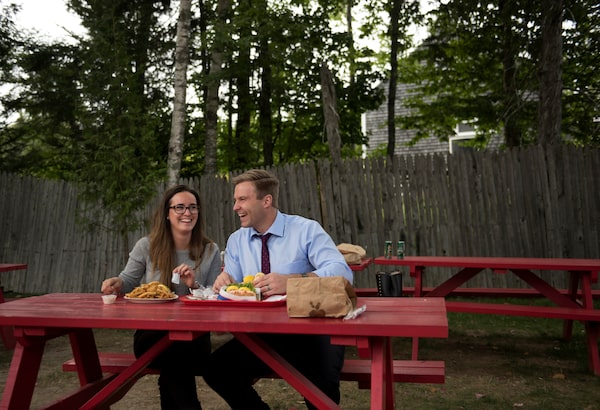 Mr. Gallant and his wife, Karine Lavoie, laugh while having dinner on the picnic tables at The Clam Digger during a campaign stop in Chamcook.Darren Calabrese/The Globe and Mail