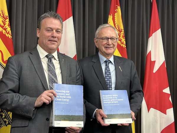 New Brunswick Natural Resources Minister Mike Holland and Premier Blaine Higgs hold up booklets on the province's energy plan, in Fredericton on Dec.13.Hina Alam/The Canadian Press