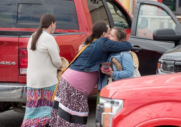 Members of the local First Nations hug outside the arrivals area of the Fredericton Airport in Lincoln, N.B., on June 8, 2020. The members were there to greet family members of a 26-year-old Indigenous woman Chantel Moore who was fatally shot by police in Edmundston, N.B.Stephen MacGillivray/The Canadian Press