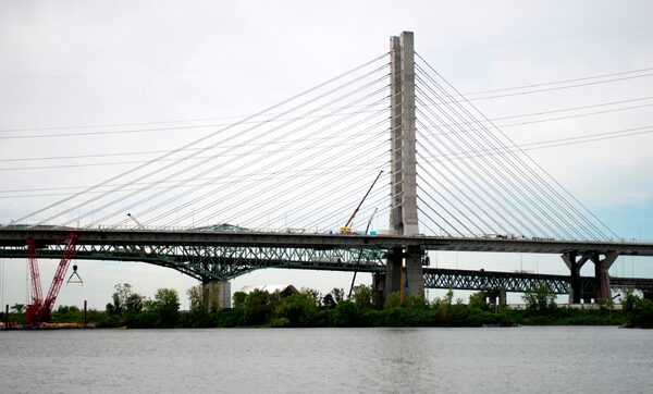 Drivers on the old bridge often slowed down to watch the bridge rise piece-by-piece.SEBASTIEN ST-JEAN/AFP/Getty Images