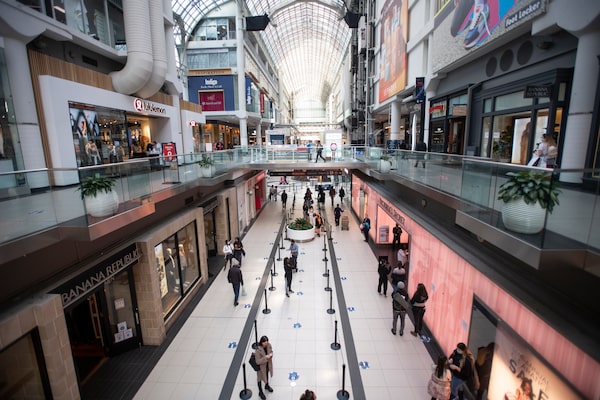 While not as crowded with shoppers as it might normally be, the Eaton Centre was open for business with people lining up outside a few stores on March 10, 2021.Fred Lum/The Globe and Mail