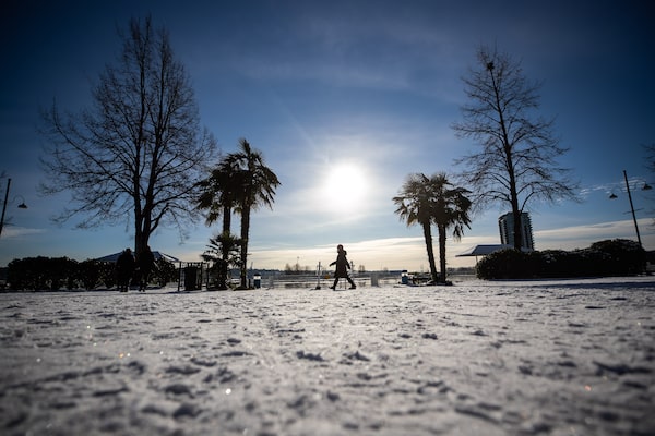 Snow covers the ground as a person bundled up for the cold weather is silhouetted while walking past palm trees on the waterfront in New Westminster, B.C., on Dec. 28.DARRYL DYCK/The Canadian Press