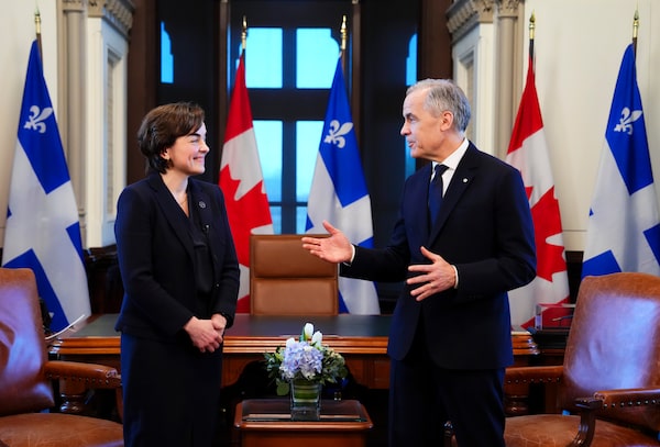 Prime Minister Mark Carney speaks with new Quebec Premier Christine Fréchette in his Parliament Hill office on Friday.Sean Kilpatrick/The Canadian Press