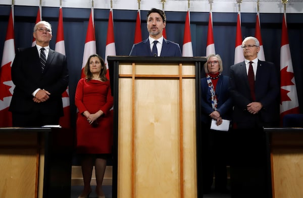 Canada's Prime Minister Justin Trudeau speaks to news media along with cabinet members, left to right, Minister of Public Safety and Emergency Preparedness Bill Blair, Deputy Prime Minister Chrystia Freeland, Minister of Crown-Indigenous Relations Carolyn Bennett, and Minister of Transport Marc Garneau in Ottawa, Ontario, Canada February 21, 2020.PATRICK DOYLE/Reuters