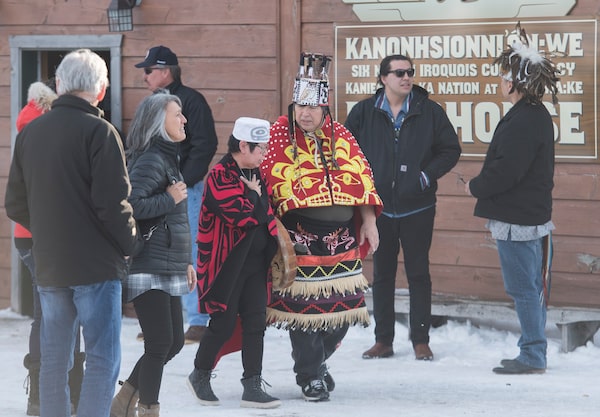 People leave a meeting between Wet'suwet'en hereditary chiefs and Mohawk leaders on the Kahnawake Mohawk Territory south of Montreal, Saturday, February 22, 2020.Graham Hughes/The Canadian Press