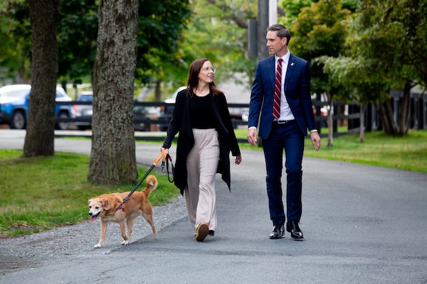 Newfoundland and Labrador Liberal Leader John Hogan, accompanied by his wife Gillian and dog Rooney, arrive at Government House in St. John's on Monday.Paul Daly/The Canadian Press