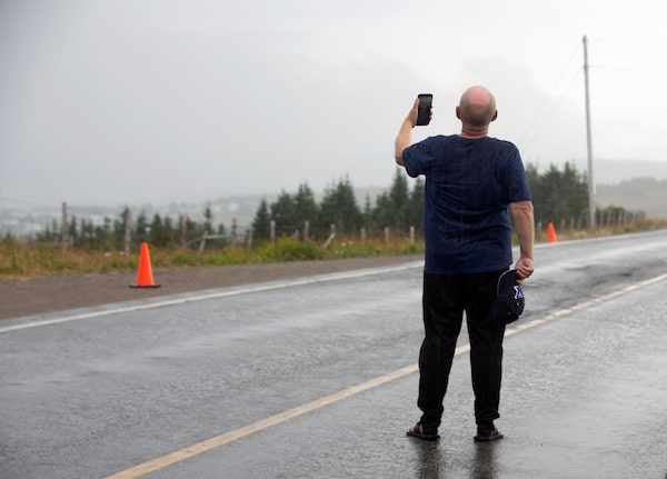 Kingston resident Eugene Howell films heavy rain in Burnt Point, Newfoundland on Friday, where he and other residents have been evacuated due to wildfire.Paul Daly/The Canadian Press