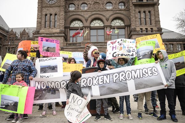 Kashechewan chief Leo Friday joins other members of the First Nation at a rally demanding the relocation of the community, in front of Queen's Park in Toronto, on April 29, 2019.Christopher Katsarov/The Canadian Press